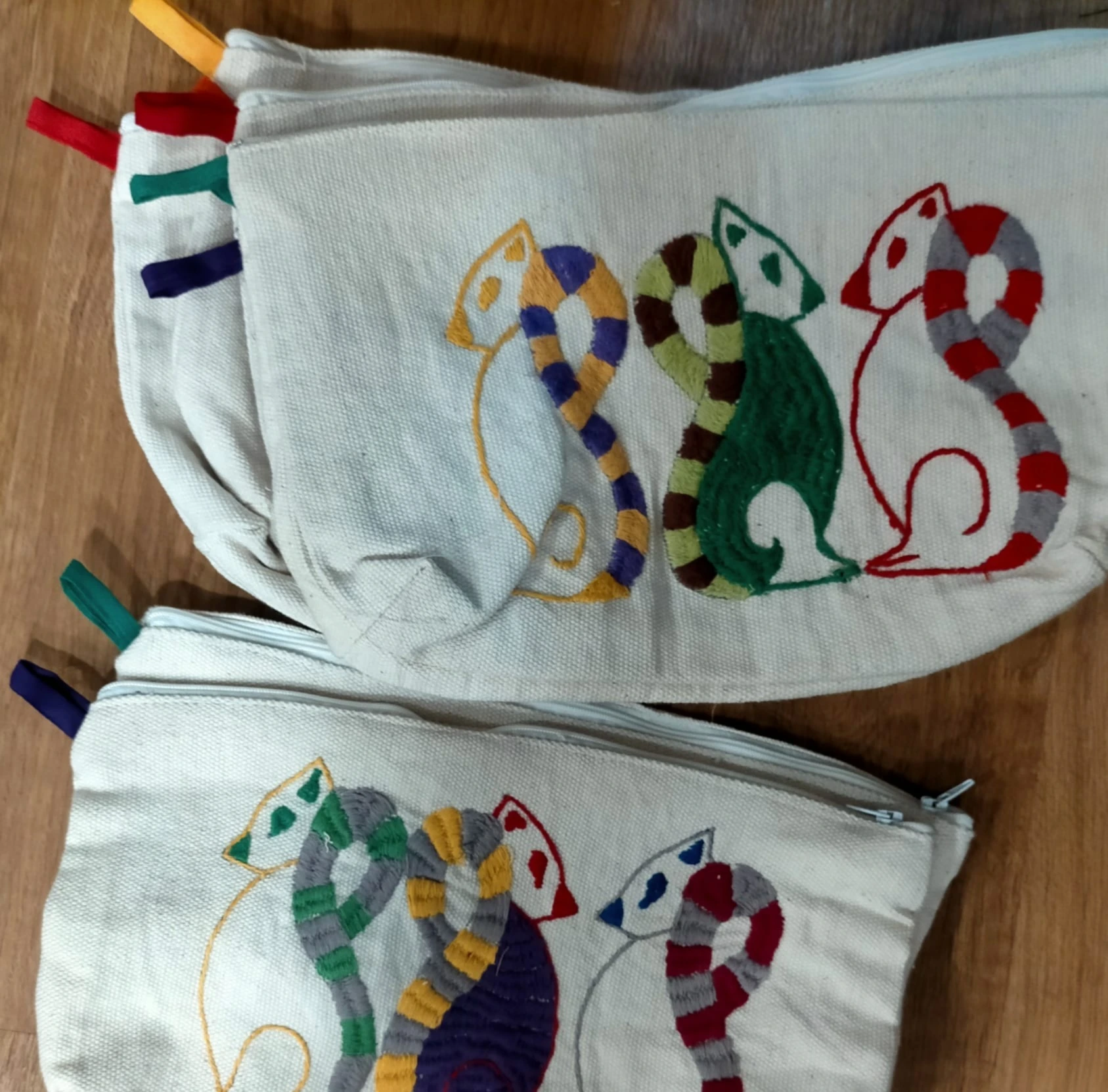 Nuestros productos incluyen manteles, paneras, marcos, cojines, bolsos, neceseres, estuches y monederos. Debido a la naturaleza artesanal del proyecto, no podemos garantizar un stock permanente. Por ello, mostramos aquí una selección de productos que sirve como referencia del tipo de artículos que realizamos.